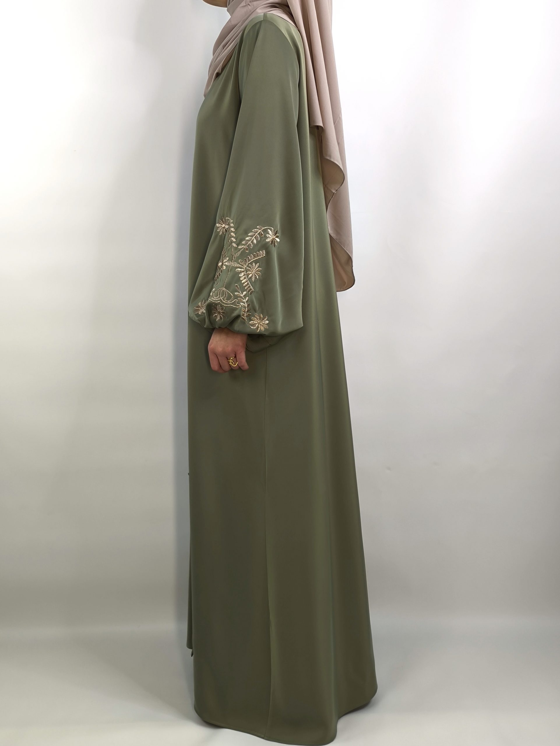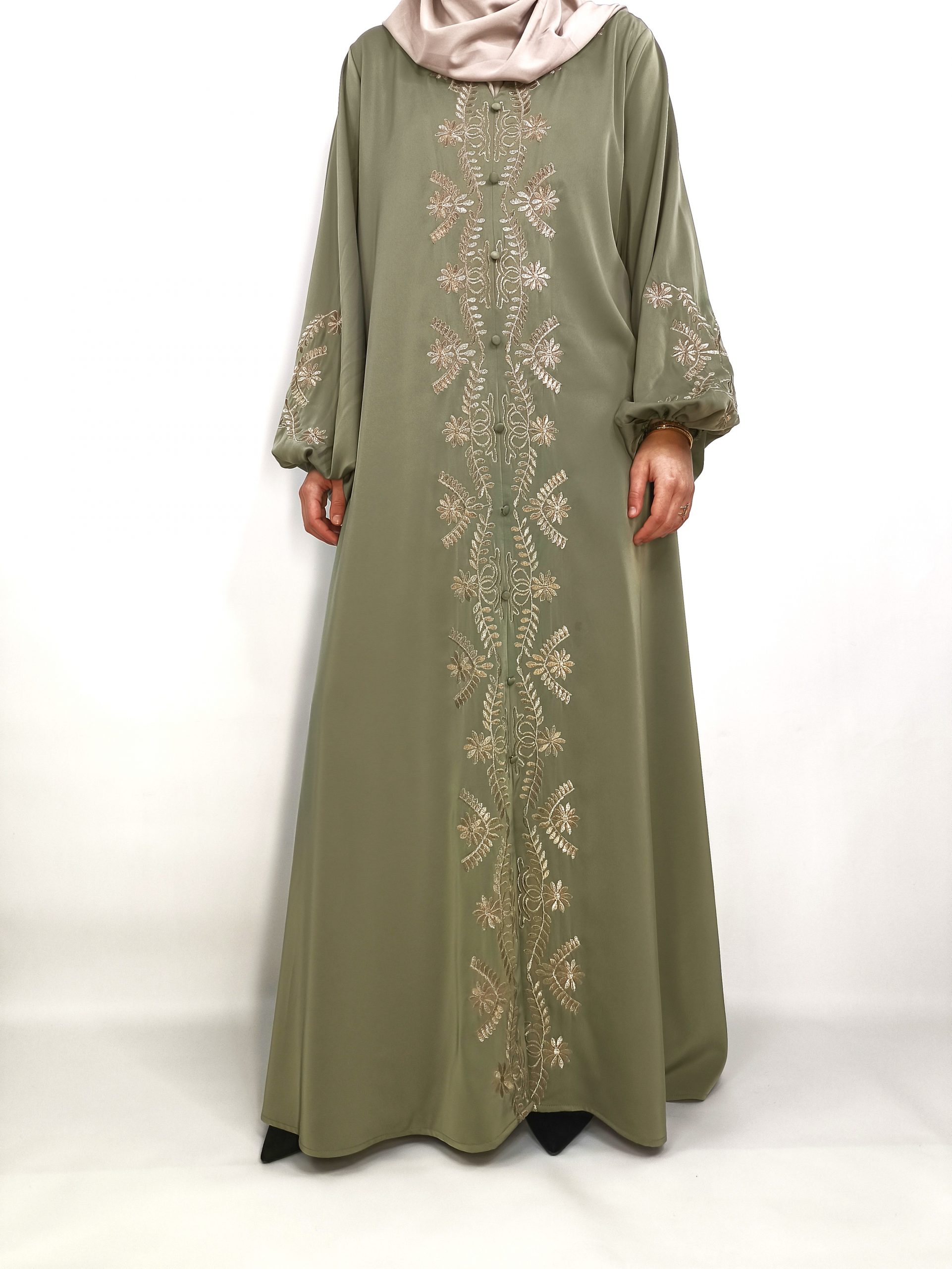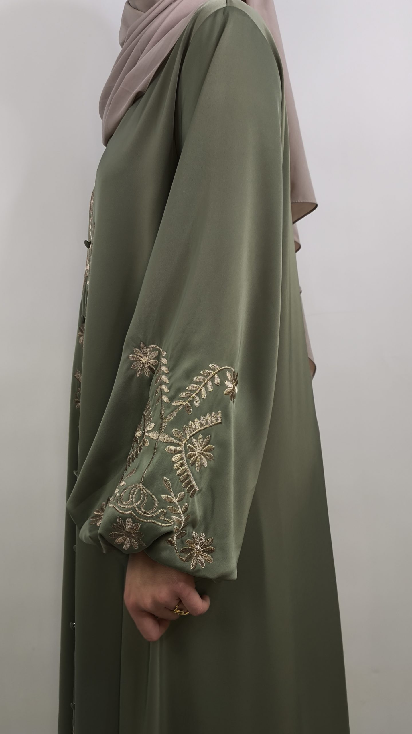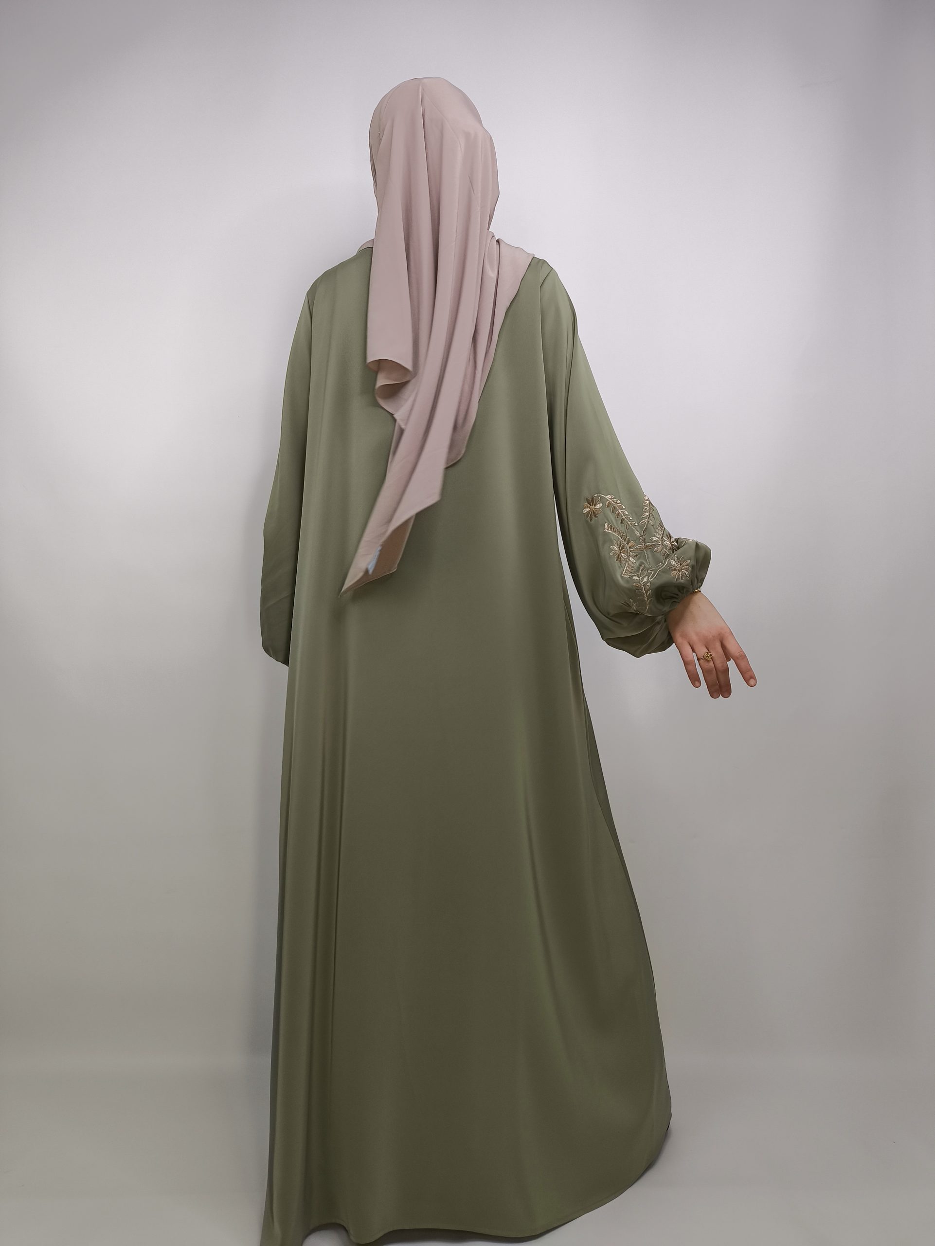 Sa couleur vert olive profonde, à la fois douce et élégante, s’associe parfaitement à de délicates broderies dorées, apportant une touche lumineuse et précieuse sans en faire trop. Cette abaya incarne l’équilibre parfait entre sobriété, élégance et féminité.