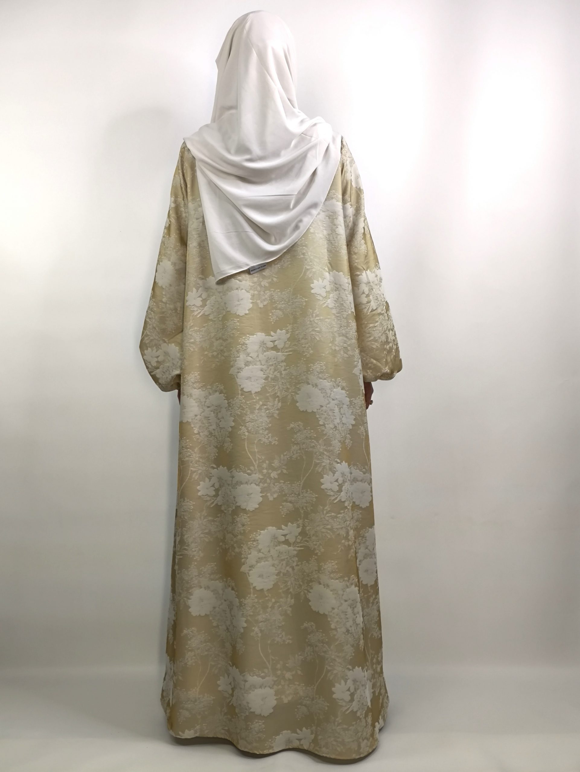 Apportez une touche d’élégance à votre garde-robe avec cette Robe abaya longue dorée jacquard. Les manches bouffantes avec élastique ajoutent un style raffiné tout en garantissant confort et liberté de mouvement.