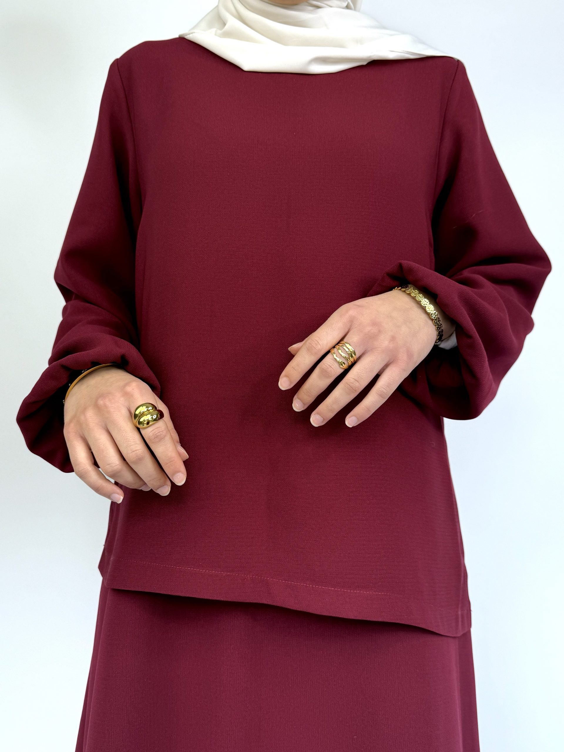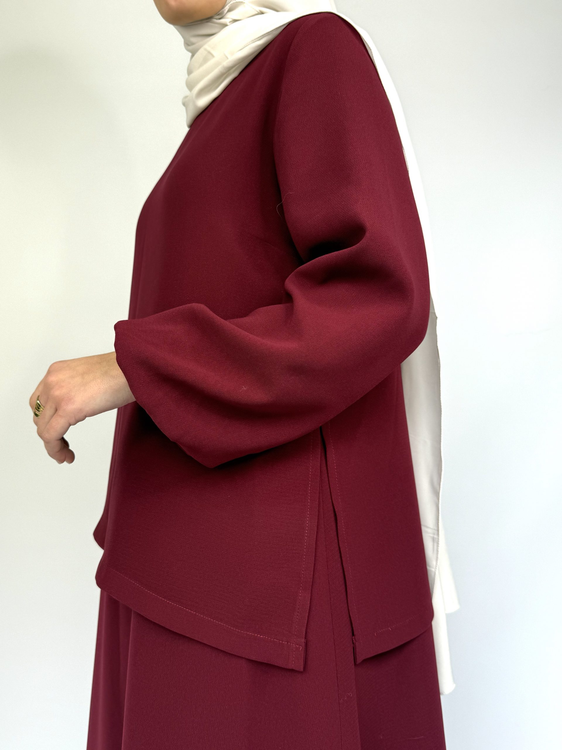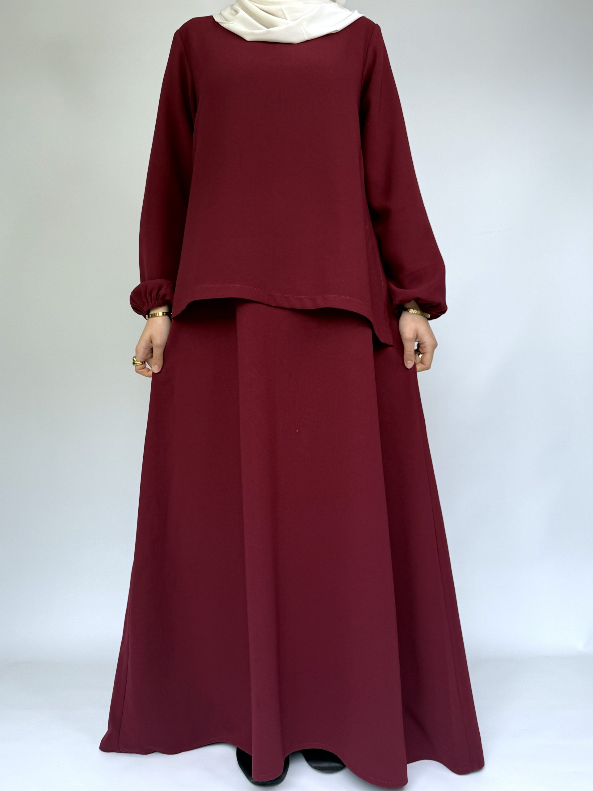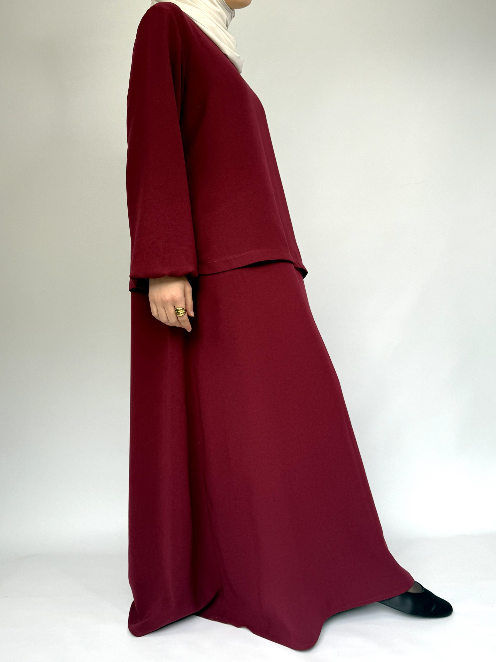 Cette robe longue bordeaux fluide s’inscrit parfaitement dans une démarche de mode femme modeste. Elle allie pudeur, élégance et modernité dans une coupe minimaliste intemporelle.