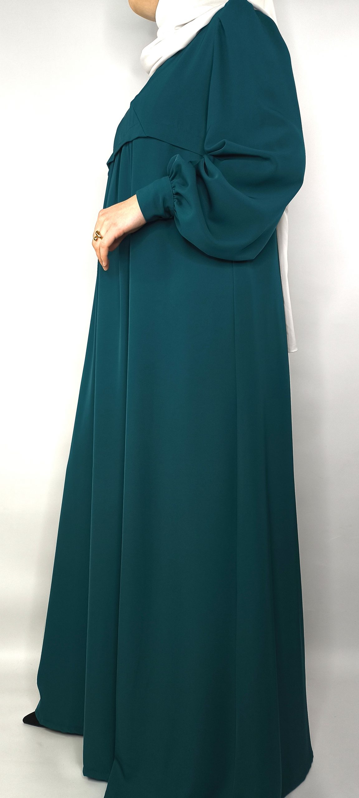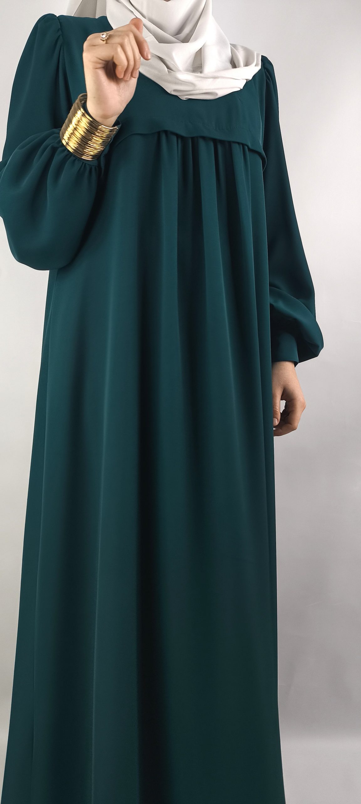 La coupe poitrine froncée sous la poitrine met en valeur la silhouette, tandis que les manches bouffantes ajoutent une touche féminine et tendance. La longueur de la robe allonge la ligne et convient aussi bien aux occasions spéciales qu’aux looks du quotidien chic.