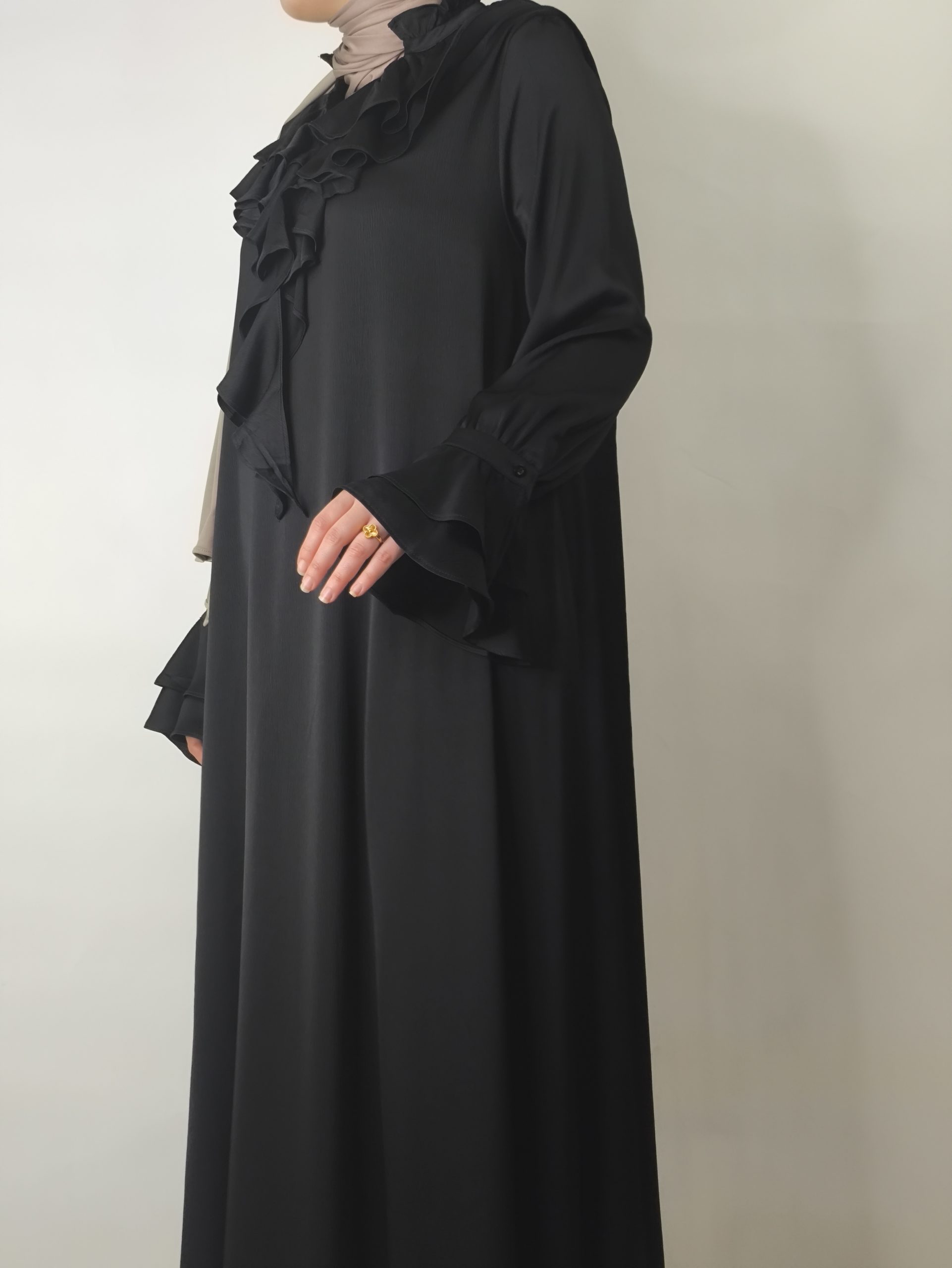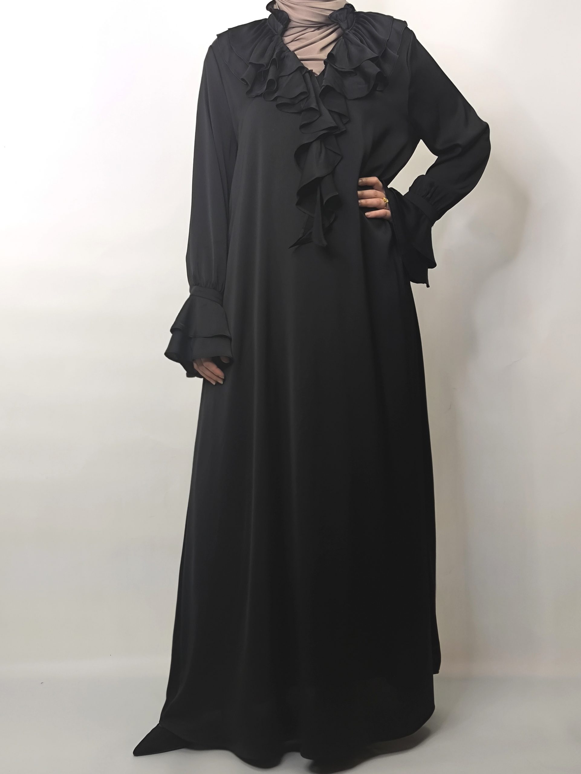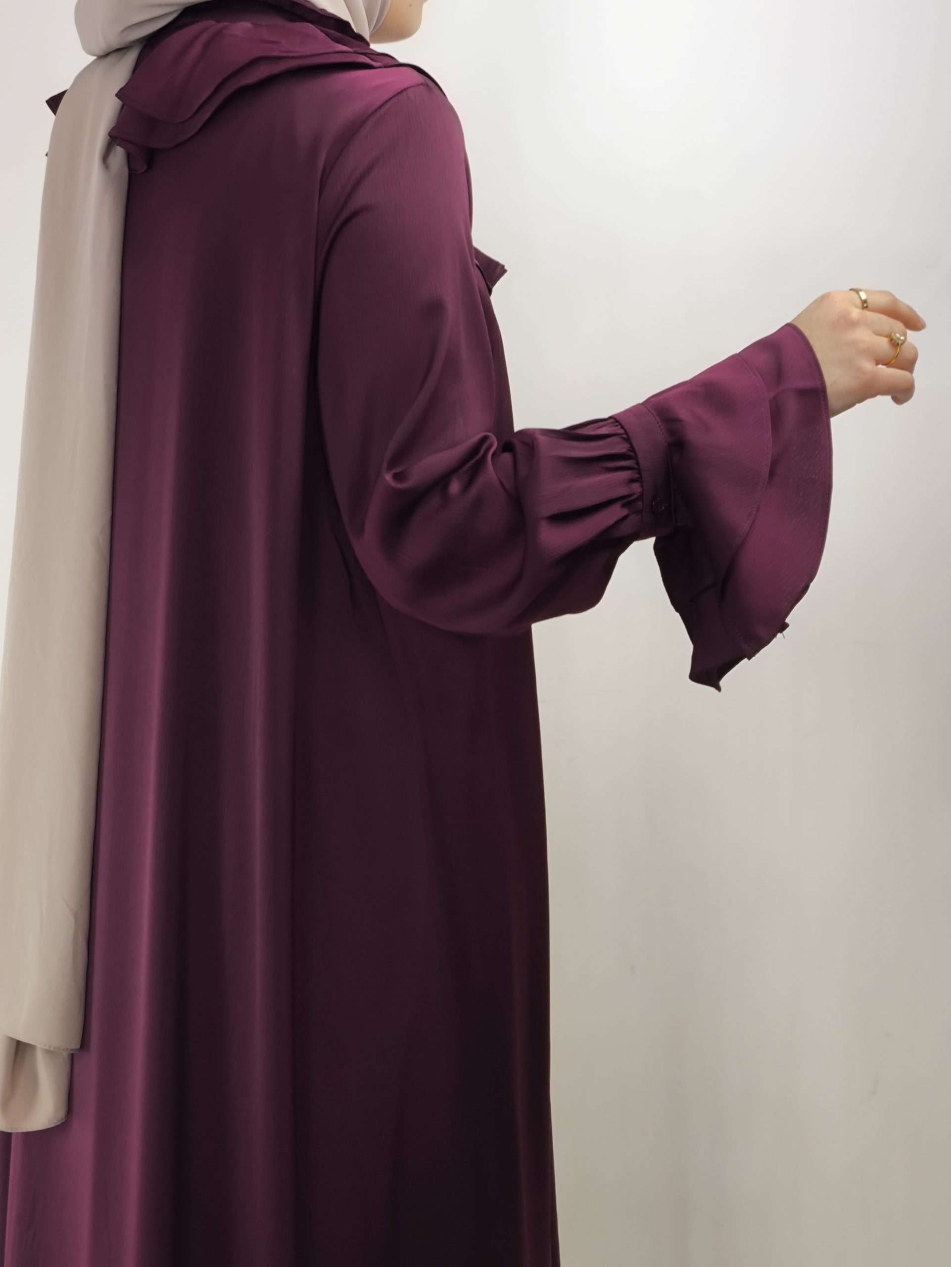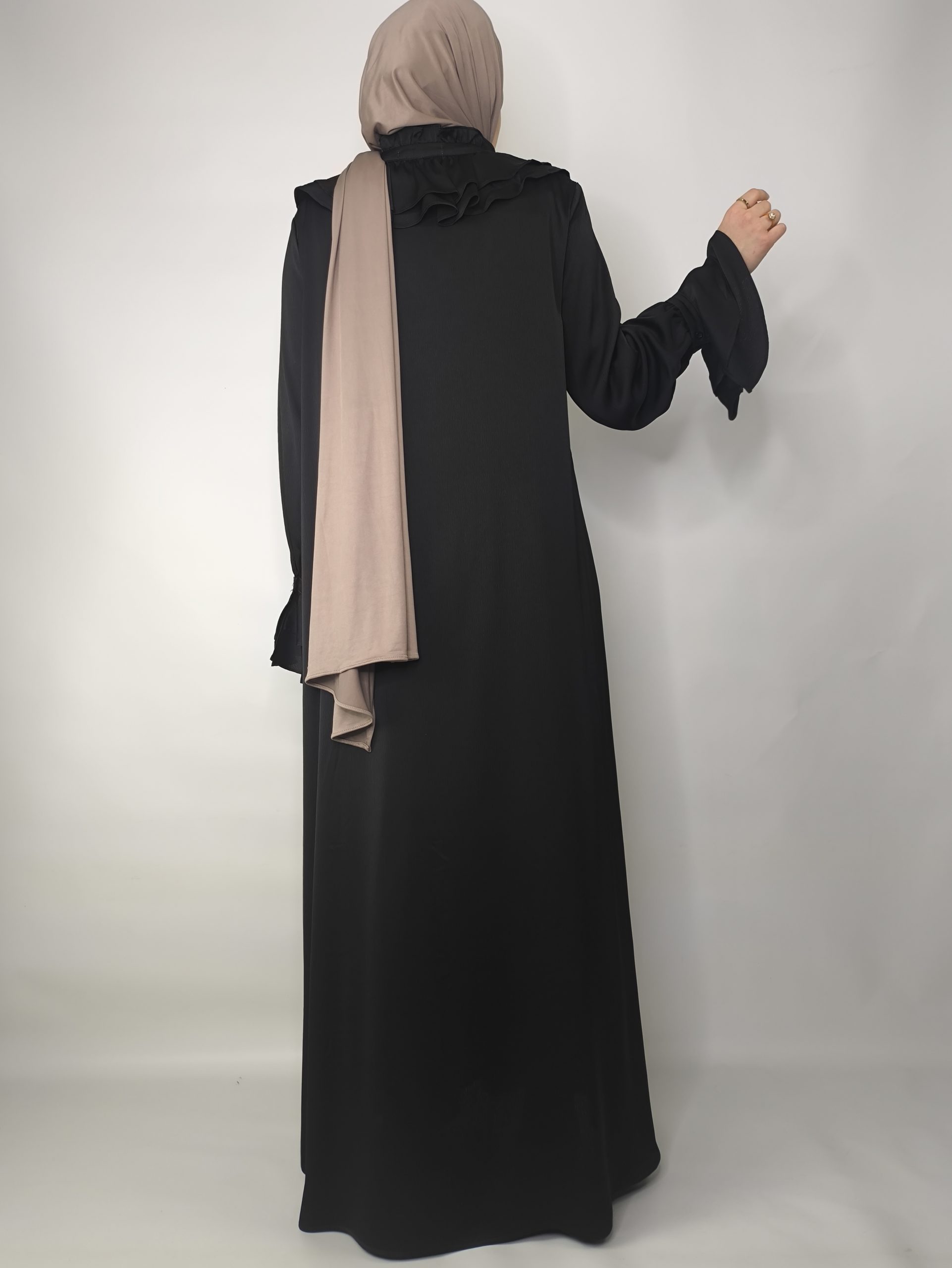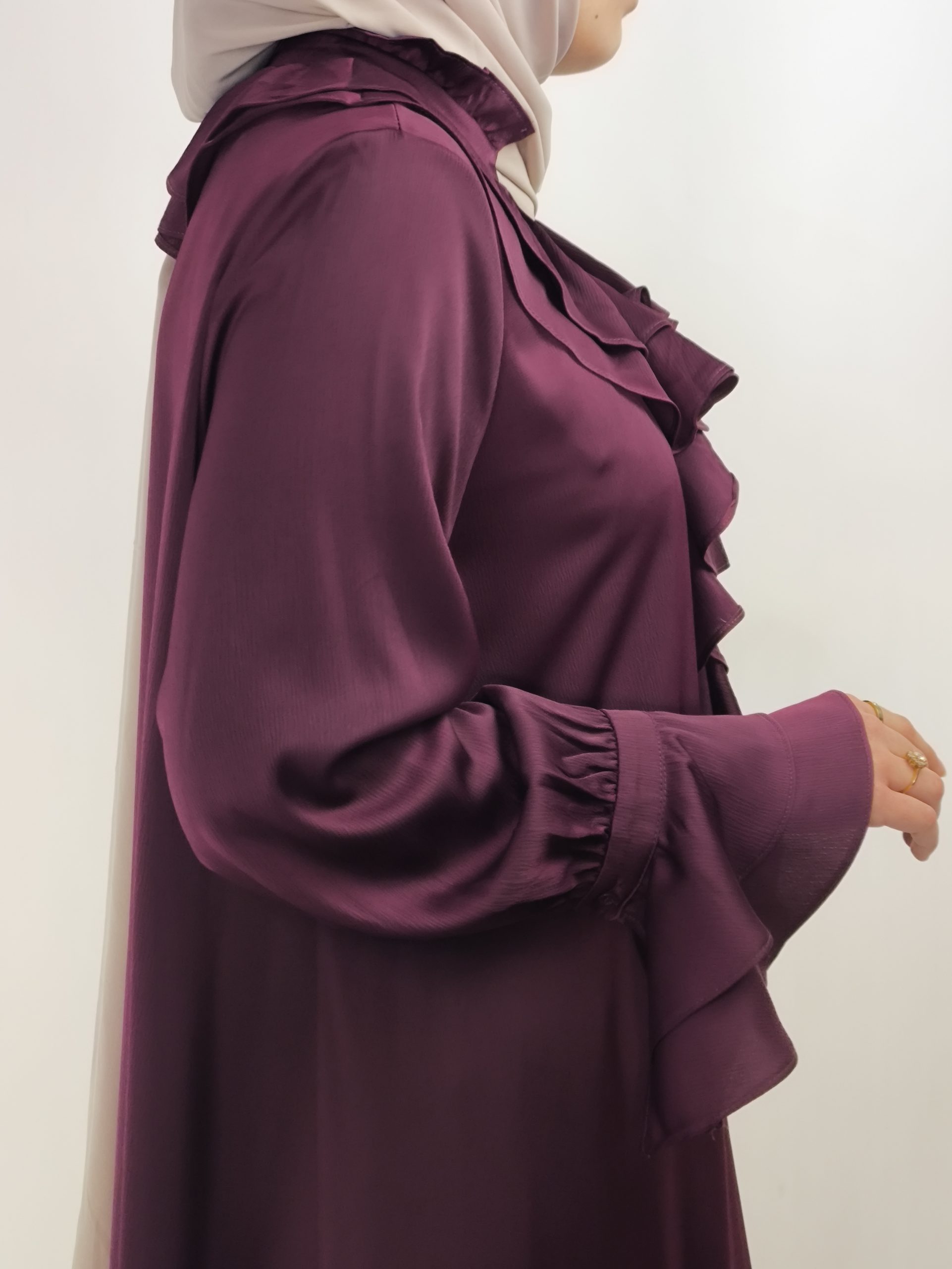 Grâce à sa coupe pudique et fluide, cette robe convient parfaitement pour se rendre à la mosquée ou participer à des soirées de Ramadan et événements familiaux. Les volants délicats autour du col ajoutent une touche féminine et sophistiquée, sans être excessifs. Elle allie style, confort et respect des codes de la mode pudique.