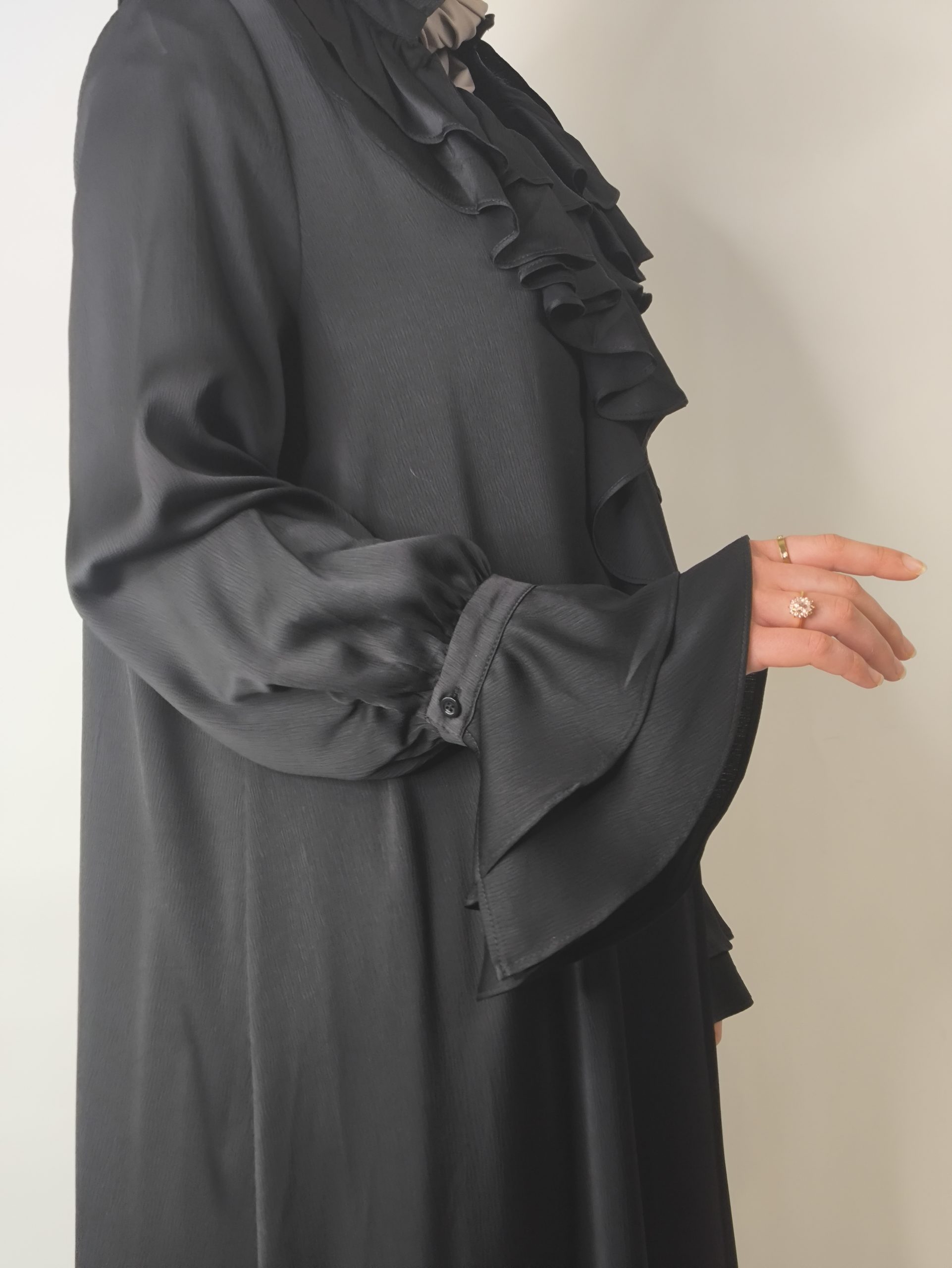 Cette robe noire satinée à volants est une pièce essentielle pour celles qui recherchent une tenue élégante et pudique. Elle se porte facilement pour les occasions religieuses et festives, tout en restant élégante et moderne.