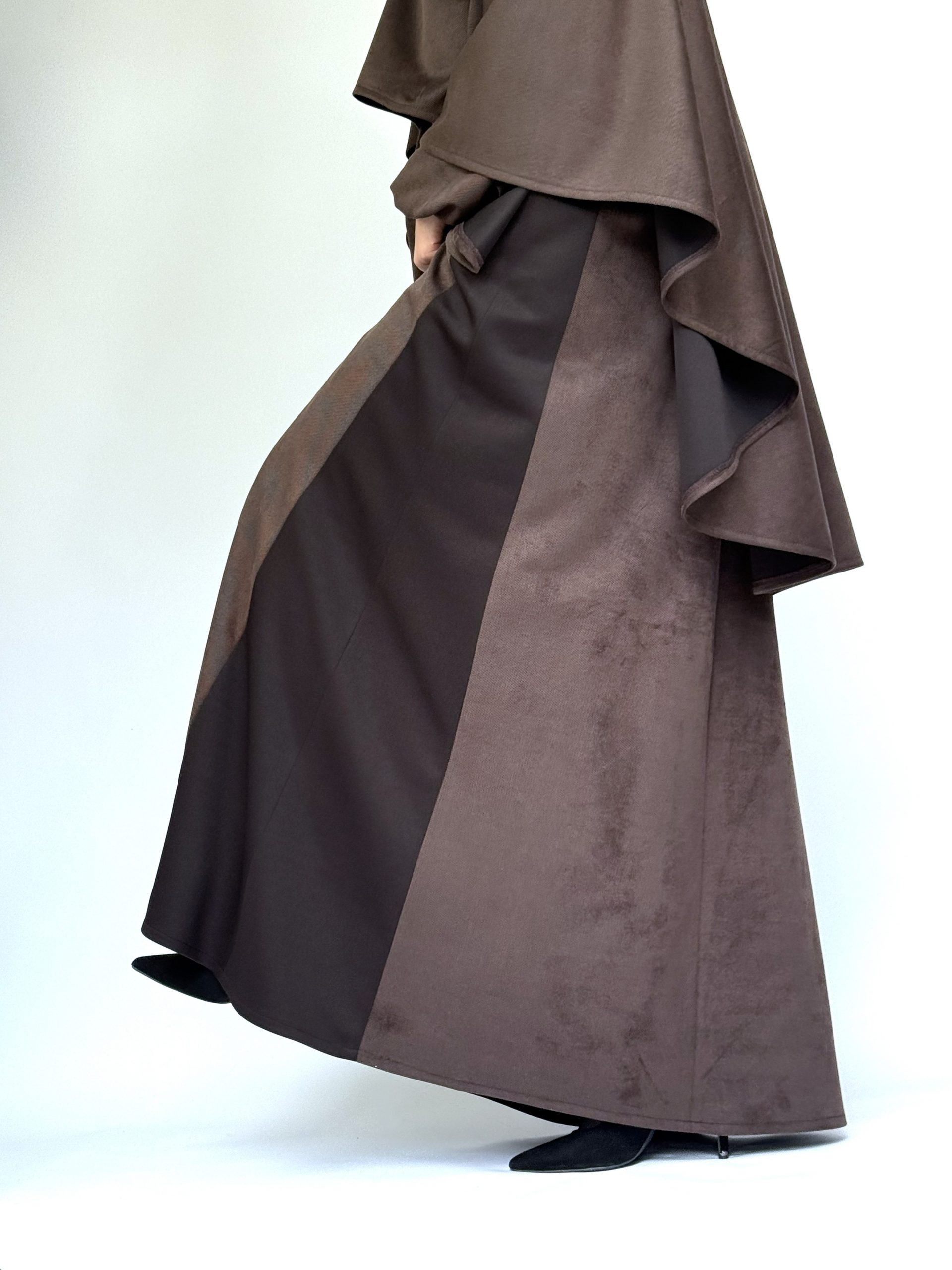 Robe velours allaitement cape marron élégante et pudique. Ensemble robe longue et cape assortie avec ouverture discrète pour allaitement, idéal pour occasions et quotidien.